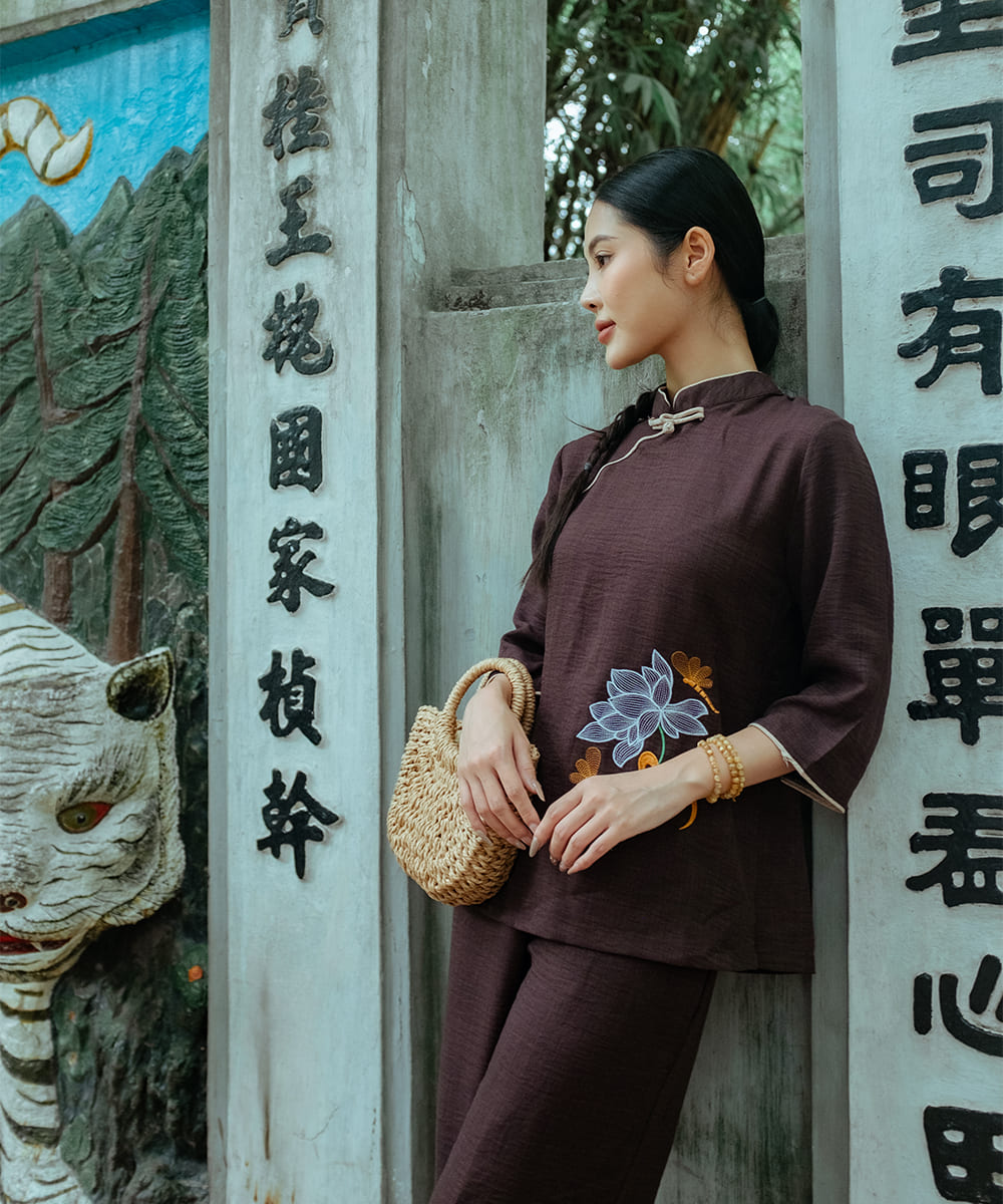 Tên sản phẩm: | Quần áo phật tử nữ màu nâu thêu hoa sen |
